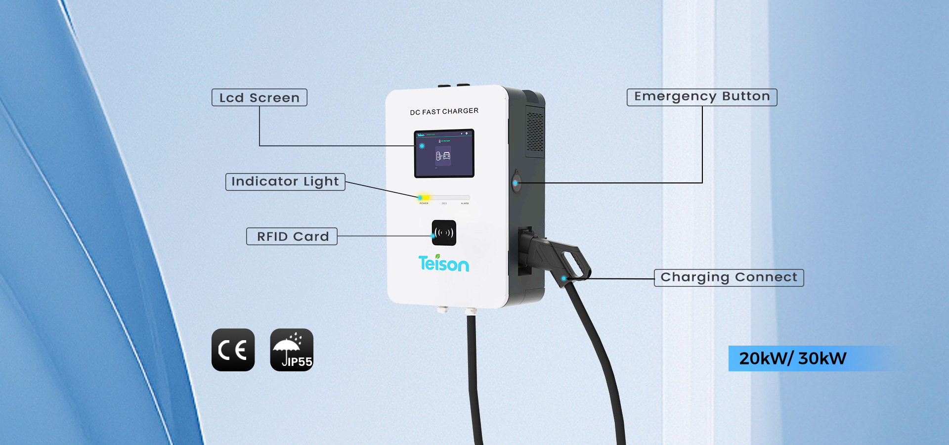 Зарядная станция Teison DC EV отличается более мощными возможностями вычисления и обработки данных, более интеллектуальной стратегией диспетчеризации, улучшенными характеристиками рассеивания тепла и пониженным уровнем шума, а также полностью соответствует требованиям мощной зарядки постоянного тока транспортных средств с глобальным стандартным интерфейсом постоянного тока.