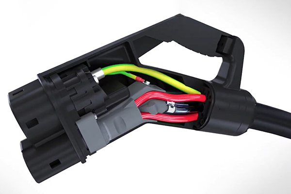 Внутри высокомощного разъема CSS видны кабели переменного тока (зеленые) и жидкостное охлаждение для кабелей постоянного тока (красные).